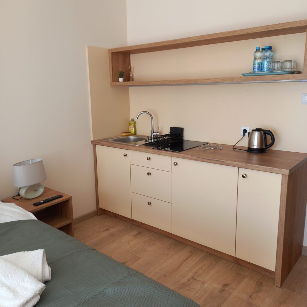 Do dyspozycji Gości jest w pełni wyposażony aneks kuchenny (lodówka, czajnik, płyta ceramiczna, garnki, naczynia i sztućce) oraz łazienka z prysznicem.